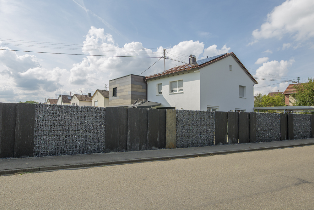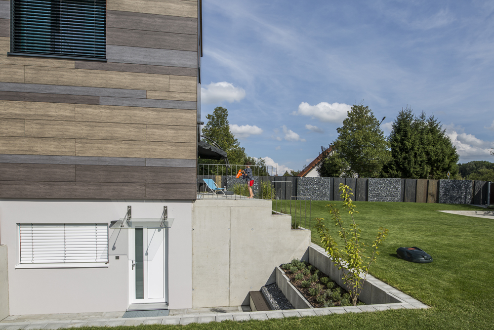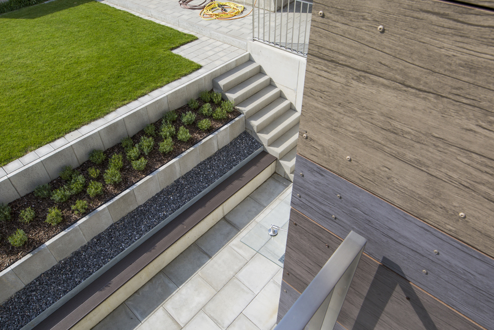 Die ehemaligen Anbauten (Garage, Terrassierungen und Wintergarten) wurden rückgebaut, um die Außenanlage passend zum Ensemble Bestand / Neubau gestalten zu können. Eine großzügige Stufenanlage fasst die Terrasse und verbindet das erhöhte Erdgeschoss mit dem Garten. Die Straßenseite im Norden wird durch neue Vordächer aus schlichtem Beton gesäumt und bewahren die gewünschte Privatsphäre. Die Dächer bieten Platz für eine "Fahrradbox" an der Ostseite und im Westen für eine Doppelgarage.