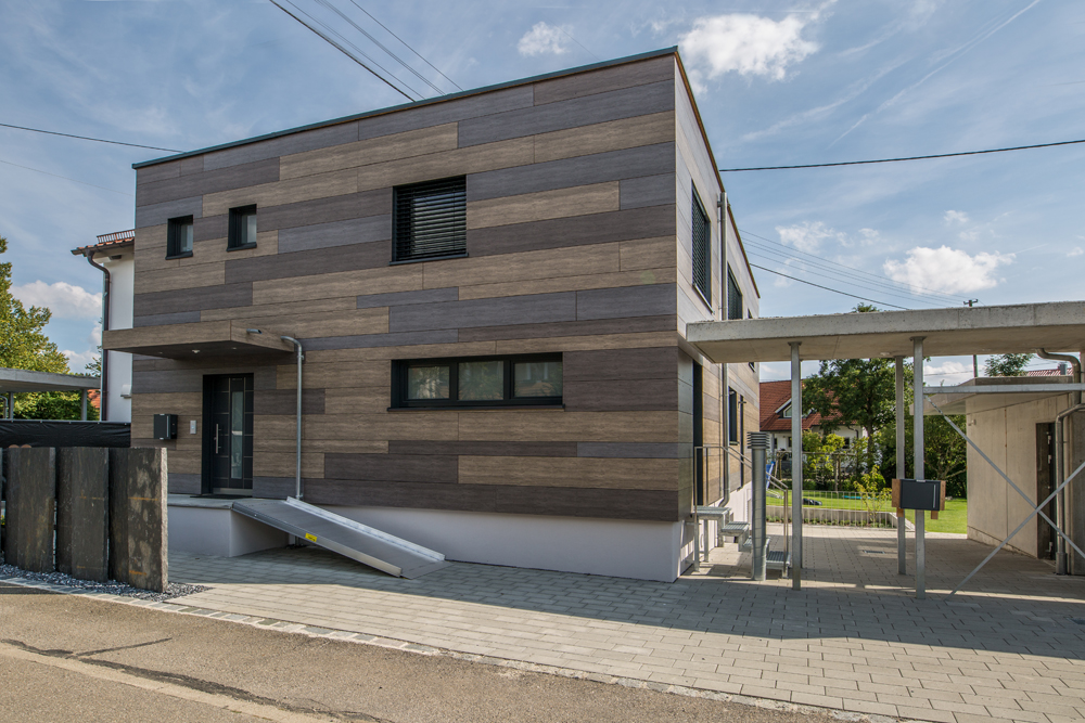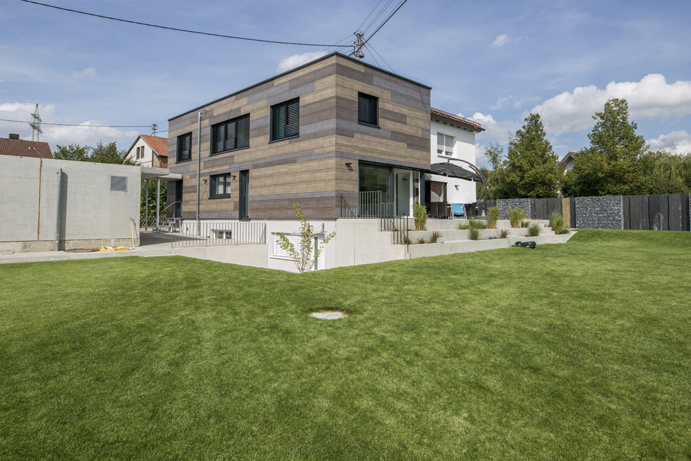 Entwurfskonzept war nun, dem Satteldachhaus einen Neubau im Westen anzugliedern, der sich an das bestehende Haus anlehnt. Der Flachdachbau passt sich in der Höhe an den vor ein paar Jahren ergänzten Windfang an. Durch die durchgehende Fassadenbekleidung wirkt der Windfang und der Neubau wie aus einem Guss. Das Untergeschoss wurde aus WU-Beton ausgeführt, Erd- und Obergeschoss komplett aus Holzfertigteilen erbaut (Wände und Decken System Leno-Tec Massivholzhaus).