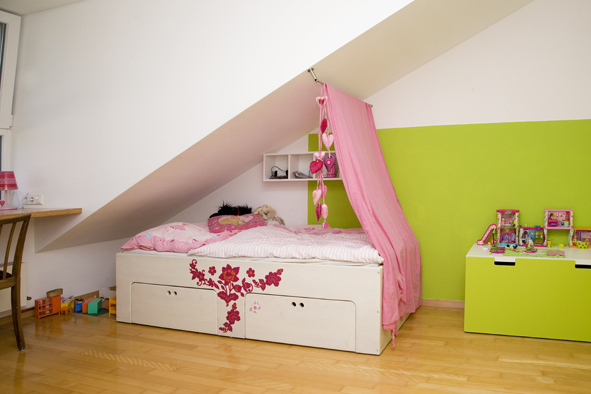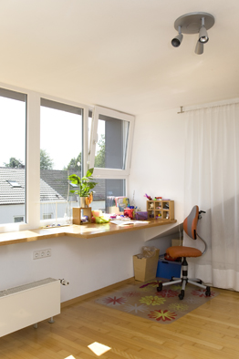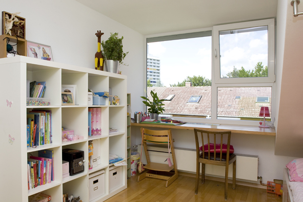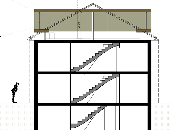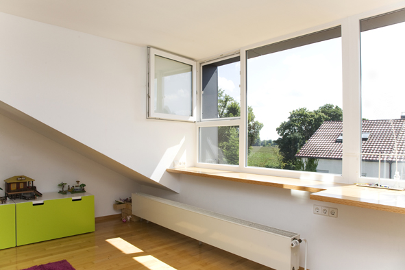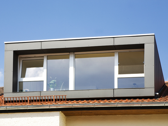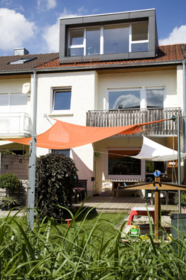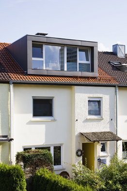 Der Wohnraum des Reihenhauses der Familie B. musste erweitert werden. Dies wurde durch den Neubau einer Gaube im Dachgeschoss erreicht. Die Gaube wurde als Körper ausgeführt, der durch das bestehende Dach „durchgesteckt wird. Dies ist besonders gut im Schnitt ersichtlich