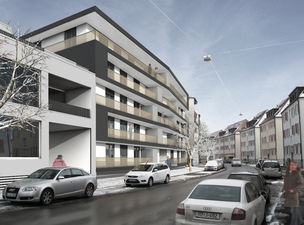 Flexibilität in den Grundrissen; gestaltete Übergänge zwischen Innen und Außen; große und vielfältige, den Wohnungen zugeordnete, Freibereiche Prinzipiell gleiche Raumcluster formen eine Wohneinheit. Die Grundrisse sind so angeordnet, dass die Nebenräume wie Sanitär und Küche nach Norden ausgerichtet und möglichst viel Wohn- und Schlafräume auf die attraktivere Südseite orientiert sind. Die Schlafräume sind qualitativ gleichwertig und können flexibel genutzt werden. Im Erdgeschoss befindet sich, zentral angeordnet, ein Gemeinschaftsraum, der von den Hausbewohnern oder externen genutzt werden kann. Das Gebäude folgt in seiner Hülle zunächst den Vorgaben aus den Grundrissen. Dem daraus entstandenen Volumen sind Balkone vorgelagert, die sich an der Umgebungsbebauung bzw. den Grenzen orientieren. Die Balkone dienen als Außenraum für die jeweilige Wohnung und als „Puffer“ zwischen Straßen- und Wohnraum. Jeder der 13 Wohneinheiten ist im Freibereich eine Außenbox zugeordnet, die als Abstellmöglichkeit dient und zugleich eine Trennung der Balkoneinheiten darstellt.
