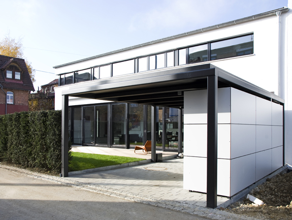 Auf einem kleinen städtischen Grundstück in der Ulmer Oststadt ist dieses nicht unterkellerte Einfamilienhaus mit kompaktem Baukörper und flachem Satteldach entstanden. Der eingeschossige Anbau, in dem die Technik des Hauses untergebracht und Platz für Fahrräder und Sonstiges vorhanden ist, wurde auf der nördlichen Grenze des Grundstücks platziert. Hier befindet sich auch der Hauptzugang des Hauses. Ein weiterer Zugang, direkt in die Küche, kann trockenen Fußes vom Carport aus erfolgen. Im Süden des Erdgeschosses findet offenes Wohnen statt. Hier folgen entlang der raumhoch verglasten Fassade Küche, Essen und Wohnen, welches durch Schiebeelemente abgetrennt werden kann. Eine offene Treppe an der Nordseite des Gebäudes, durch ein Thekenmöbel vom Essbereich getrennt, führt in das Obergeschoss. Über einen großzügigen Flur gelangt man in die einzelnen Räume der Kinder, das Schlafzimmer und die Bäder. Viel Stauraum bieten die vom Schreiner gefertigten Einbaumöbel unter der Treppe, der Garderobennische und das auf Sitzhöhe gefertigte Schrankelement mit anschließender Bücherwand im Wohnbereich. Im Garten wurde eine großzügige Holzterrasse entlang der Glasfassade angelegt, die durch Markisen im Sommer verschattet werden kann. Schutz vor Einblicken bieten Sichtbetonwände, eine dichte Heckenbepflanzung und eine Abstellbox unter dem Carport zum Nachbar hin.