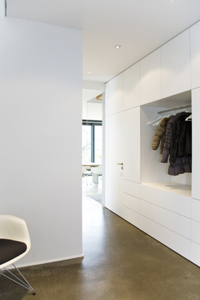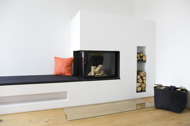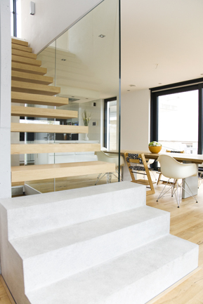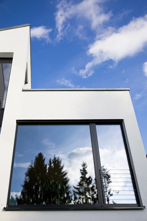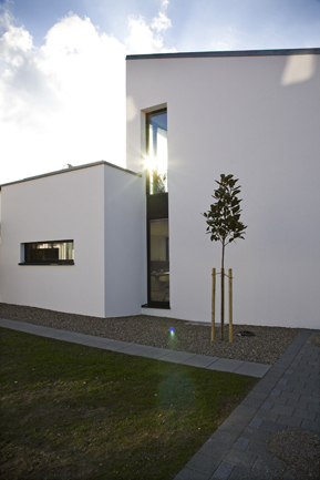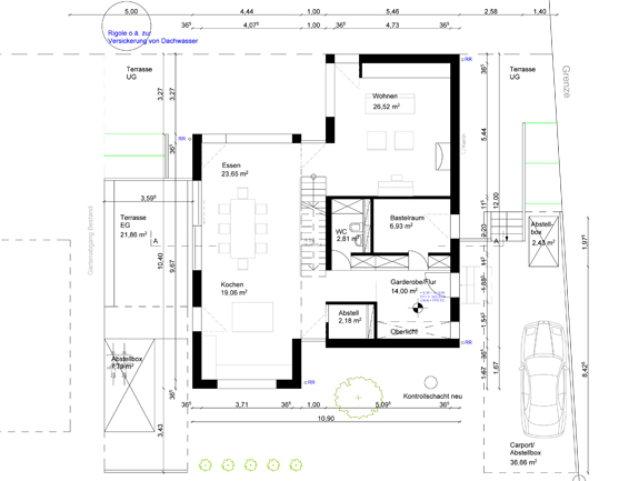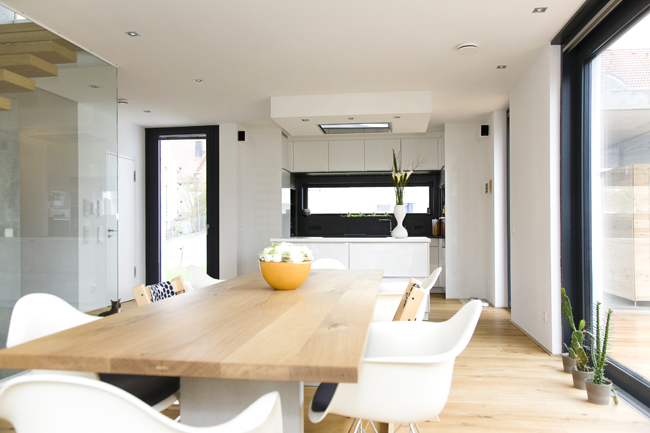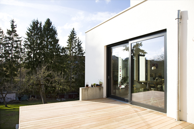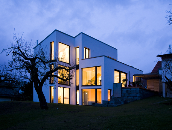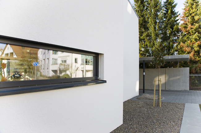 die Umgebung des neuen Wohnhauses jedoch ist über viele Jahrzehnte gewachsen. Dieser Neubau wurde auf einem bereits bebauten Grundstück platziert. Vor dem Baubeginn stand nur das Haus der Großmutter der Bauherrin dort. Alt und Neu bilden hier eine Symbiose und sind Beispiel dafür, wie drei Generationen gemeinsam neben- und miteinander wohnen. Das 3-geschossige Wohnhaus wurde in die vorgefundene Topographie eingefügt. Orientiert an den baurechtlichen Vorgaben fügen sich die beiden gegeneinander verschobenen Kuben in das Grundstück ein - der rechte Kubus mit Pultdach, der linke Gebäudeteil mit Flachdach übernimmt die Höhe des Bestandsgebäudes. Der Entwurf macht sich den steilen Geländeverlauf zunutze und ermöglicht aus dem Gartengeschoss (Kinderbereich) direkt in den Garten zu gehen. Im nicht belichteten Teil des Untergeschosses sind Technik und Kellerräume untergebracht. Die „Fuge“ trennt die beiden Kuben und dient der Erschließung des Gebäudes. Im EG, das von der Straße aus ebenerdig erschlossen wird, befindet sich der zentrale Wohn- und Essbereich der Familie. Vom überhöhten OG aus, in dem das Elternschlafzimmer, ein Bad und ein Arbeitszimmer Platz finden, ist der Zugang zur nach Süden ausgerichteten Dachterrasse möglich. Von dort aus hat man einen Überblick über das gesamte Grundstück. Sichtbetonwände und -dächer bilden im EG den Rahmen für den Carport und den Fahrradabstellbereich, mit jeweils eingestellter Abstellbox aus