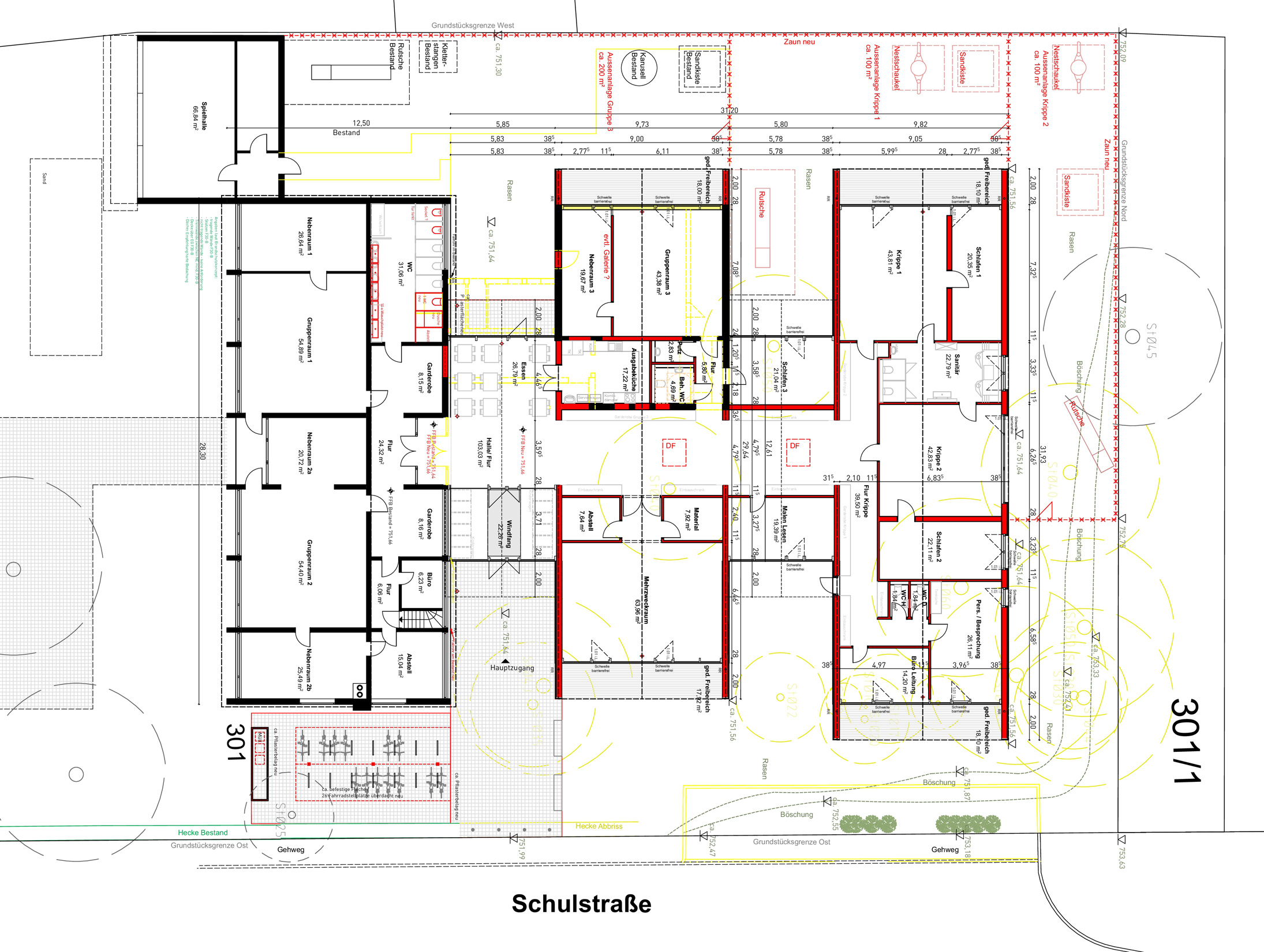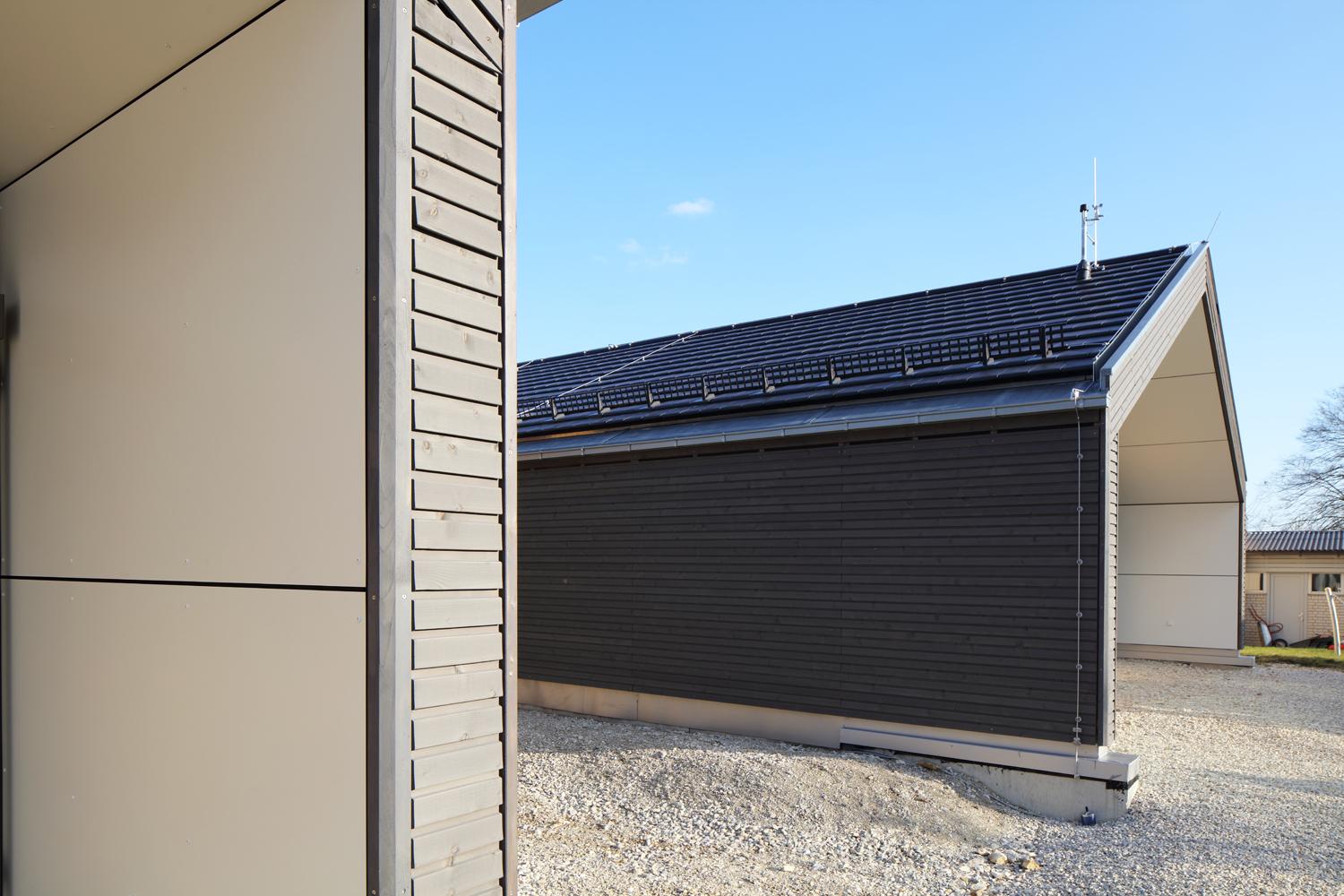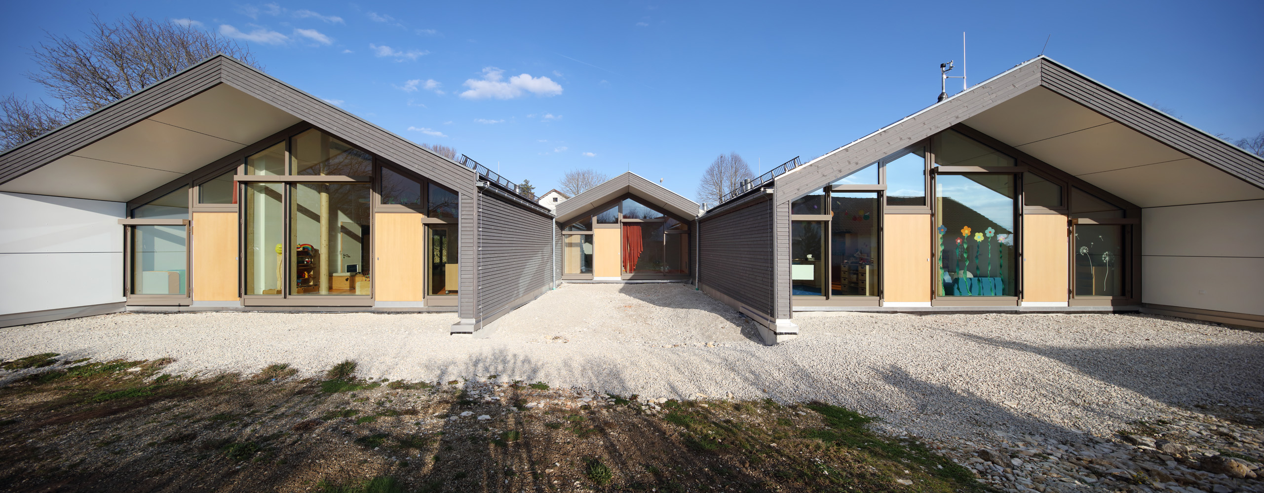 Der bestehende Kindergarten in der Schulstraße in Mehrstetten muss erweitert werden, um den erhöhten Bedarf an Kindergartenplätzen zu decken. Das Ursprungsgebäude aus dem Jahr 1969 steht im Süden des Grundstücks, im Norden befindet sich ein Anbau aus dem Jahr 1985. Um einen zentralen Eingang zu schaffen, ist die Erweiterung nördlich des Bestandsgebäudes angeordnet. Er besteht aus zwei großen Baukörpern, die an das von Hullak Rannow entwickelte Modul „Die Clevere Kita“ angelehnt sind. Dazwischen befinden sich kleinere Baukörper zur Verbindung. Die Gebäude sind eingeschossig, ohne Unterkellerung. Dem Grundriss folgend ist die Erweiterung mit ortstypischen einzelnen Satteldächern ausgebildet. Die einzelnen Satteldächer gliedern die Baumasse in maßstäbliche Größen und sind in Größe und Typologie dem Bestandsgebäude angepasst und nachempfundenen. Das Grundprinzip sind offene Innenräume bis zum First.