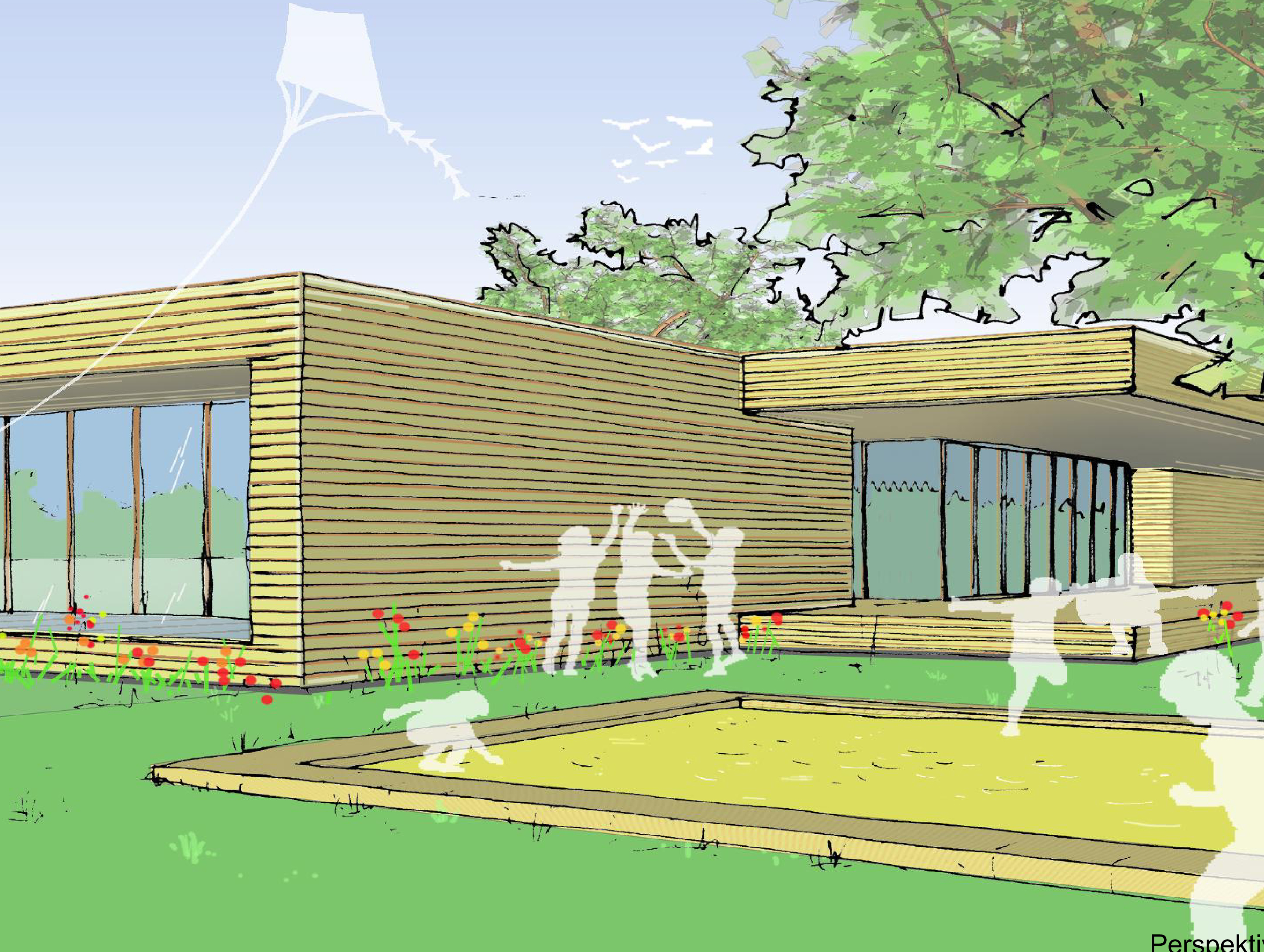 In Eggenstein Leopoldshafen soll ein Kindergarten für 6 Gruppen neu entstehen, der durch vorgefertigte Bauteile kurzfristig errichtet werden kann. Das vorliegende Konzept basiert auf gebauten Beispielen in dem die benötigten Raumeinheiten in baulichen Modulen zusammengefasst sind, die sich bedarfsgerecht gruppieren lassen. Durch die modulare Planung und vorgefertigte Holzrahmenbauweise ist eine kurzfristige Fertigstellung möglich.