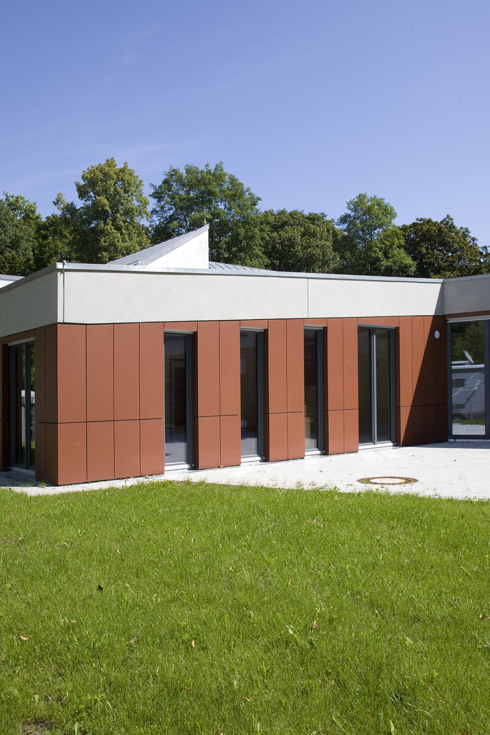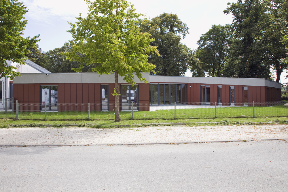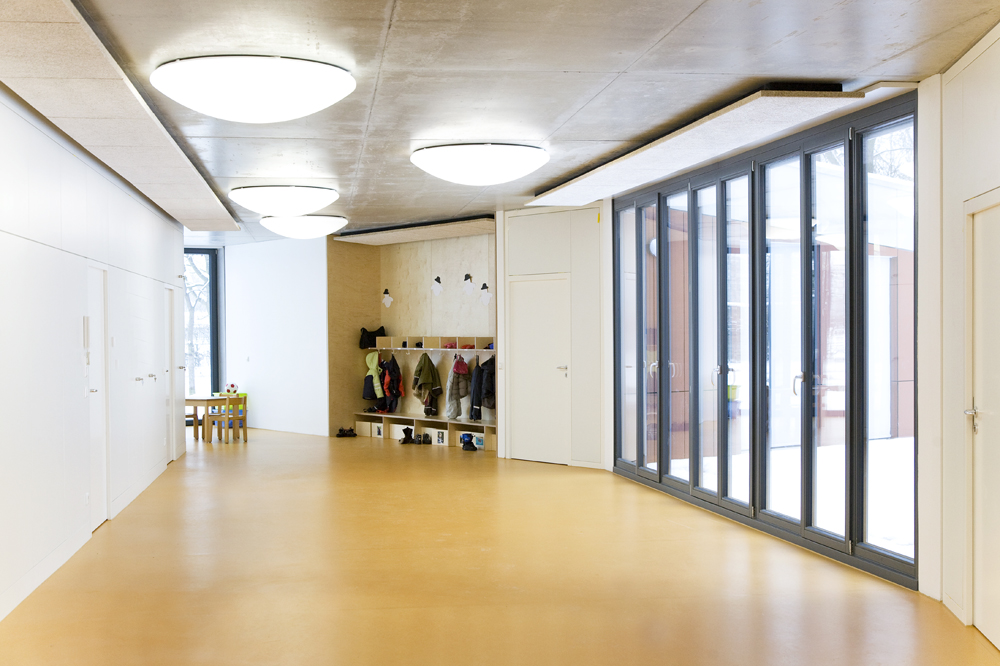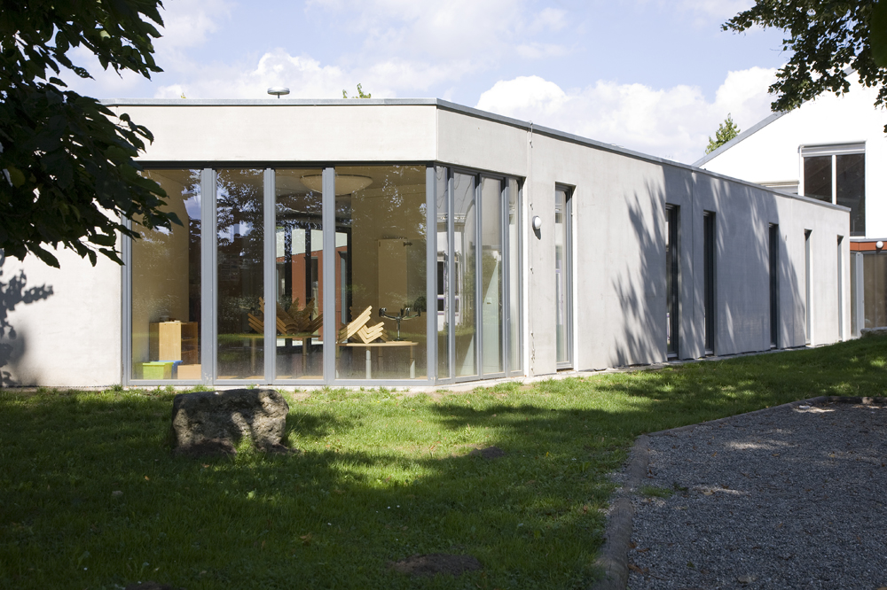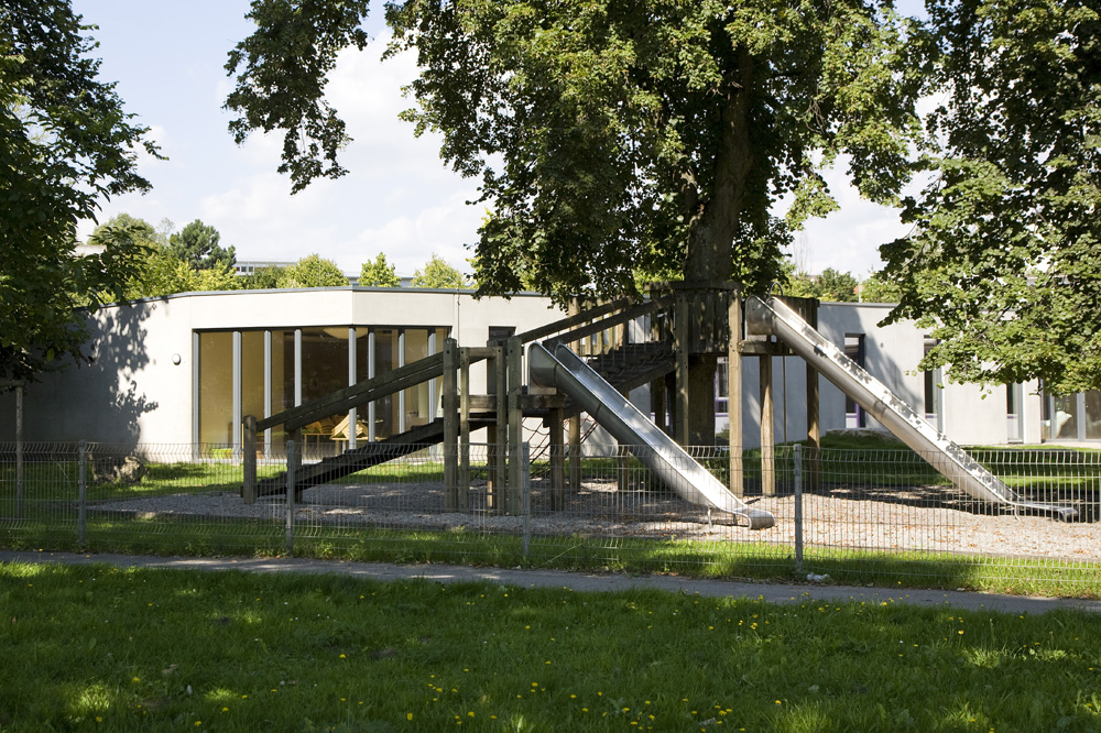 Der erhöhte Bedarf an Plätzen für Kinder unter 3 Jahren veranlasste die Stadt Ulm, ihr Angebot zu verbessern. Ein Anbau sollte die bestehende Kita um 2 Gruppen für unter 3-jährige erweitern. Ziel war es, ein Gebäude zu entwerfen, das die Bedürfnisse der unter 3-jährigen mit denen der über 3-jährigen vereinbart. So entstand ein u-förmiges Gebäude, das auf der dem alten Kitagarten zugewandten Seite einen sehr robusten „Rücken“ hat und sich zum Innenhof wie ein „weicher Kern“mit einer Holz-Glasfassade öffnet.