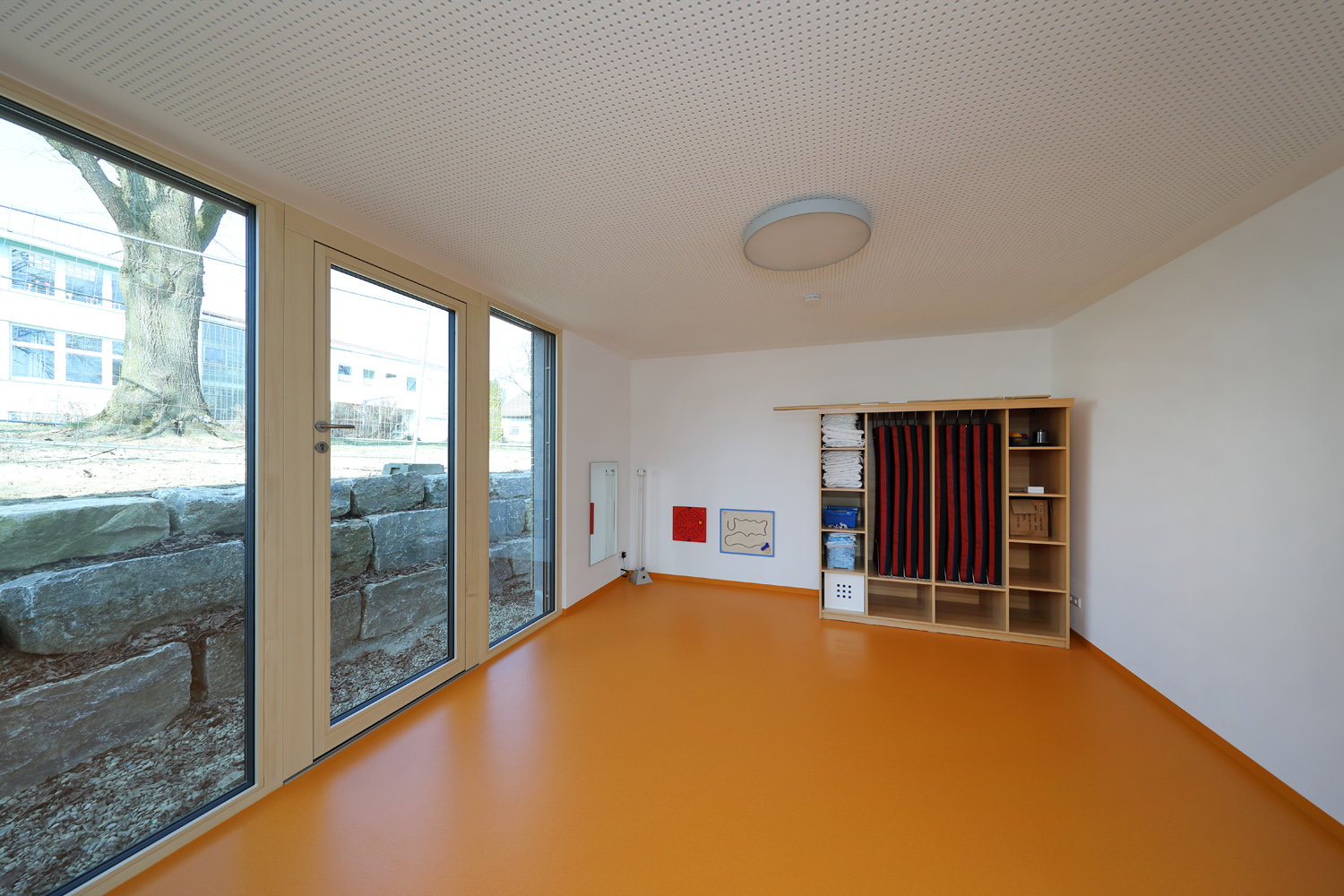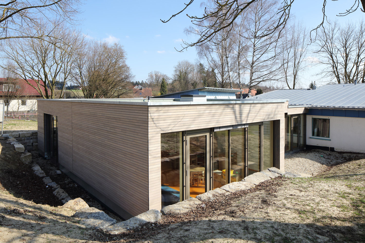 Die Gemeinde Bihlafingen ist ein Ortsteil der Großen Kreisstadt Laupheim. Der dortige zweigruppige Kindergarten musste um eine U3-Gruppe erweitert werden. Dies hat man durch den Anbau eines Moduls „Clevere Kita“ erreicht, welches im Bereich des bestehenden Eingangs „angedockt“ wurde. Alt- und Neubau werden zentral durch das Foyer erschlossen. Der dortige Garderobenbereich wurde erweitert. Im Neubau befindet sich der neue gemeinsame Essensbereich, ein Büro für die Leitung, ein Neben- bzw. Abstellraum sowie der neue Gruppenraum samt Schlaf- und Sanitärbereich. Der Gruppenraum ist so konzipiert, dass er später alle Anforderungen für eine Umnutzung vom Kita- zum Kiga-Gruppenraum erfüllt.