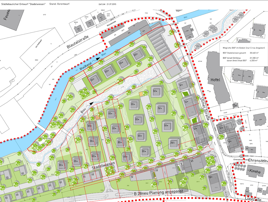 Das Gebiet Stadelwiesen liegt zwischen den Ortsteilen Klingenstein und Herrlingen in städtebaulich exponierter Lage zwischen B 28, Bahnlinie Blaubeuren-Ulm und dem Flusslauf der Blau, die einen nicht unerheblichen Flächenanteil im Gebiet einnehmen. Das Areal der ehemaligen Fa. Interglas wurde von einem Investor erworben und ist aktuell durch eine gewerbliche Mindernutzung und fehlende Entwicklungsmöglichkeiten geprägt. Die Stadt Blaustein ist aufgrund der Topographie in ihrer weiteren Entwicklung stark eingeengt, gleichzeitig besteht eine hohe Nachfrage nach Wohn- und Gewerbeflächen. Für die Stadt Blaustein ist es daher von besonderem Interesse, diesen städtebaulichen Missstand inmitten des Siedlungsbereiches zu beheben. Zusammen mit dem nördlich angrenzenden, ebenfalls zur Umwandlung anstehenden Gebiets an der Blautalstraße wurden 2008 Voruntersuchungen für ein Sanierungsgebiet eingeleitet.