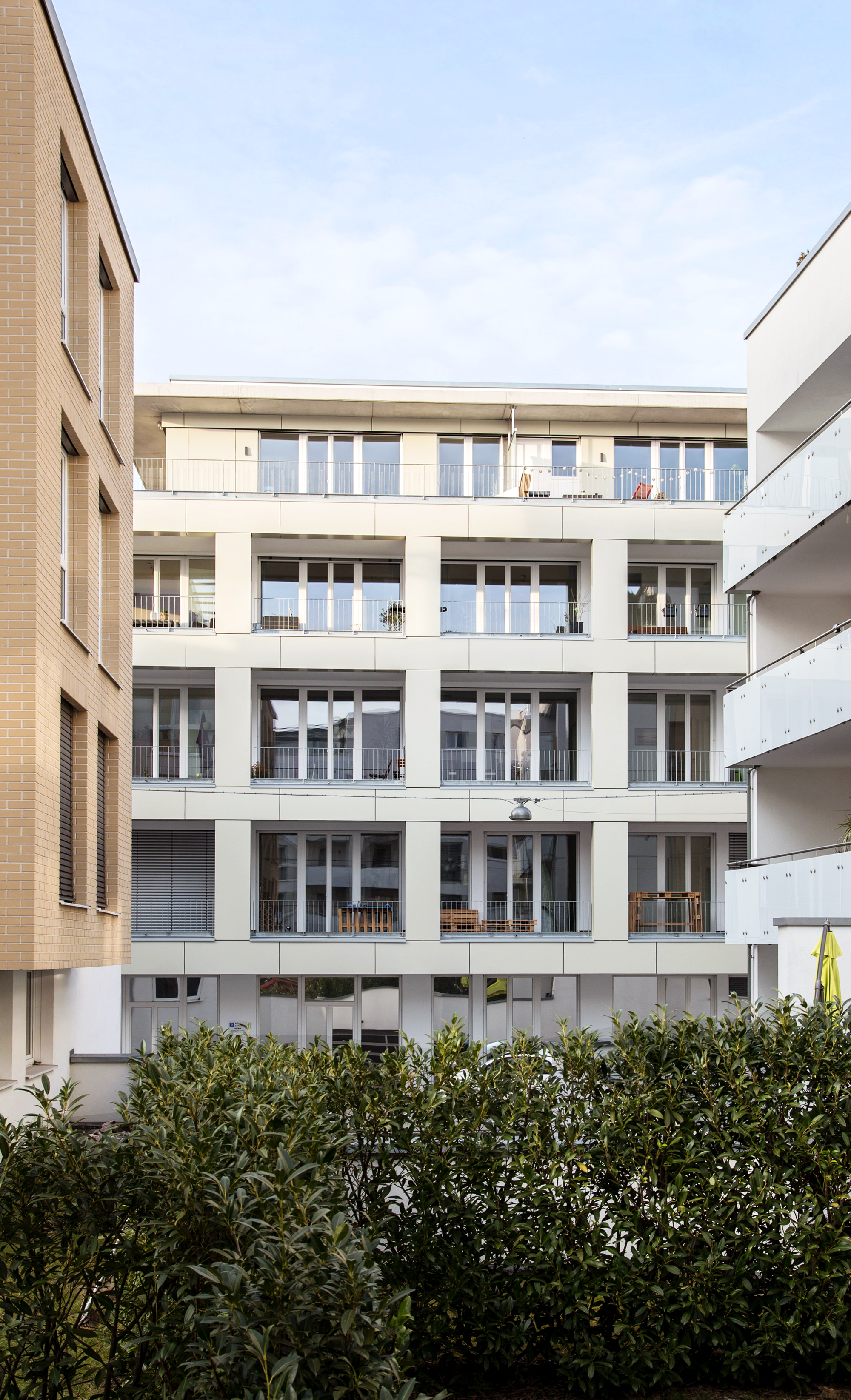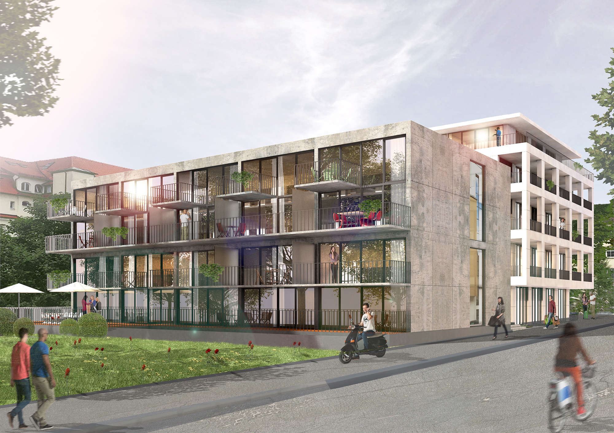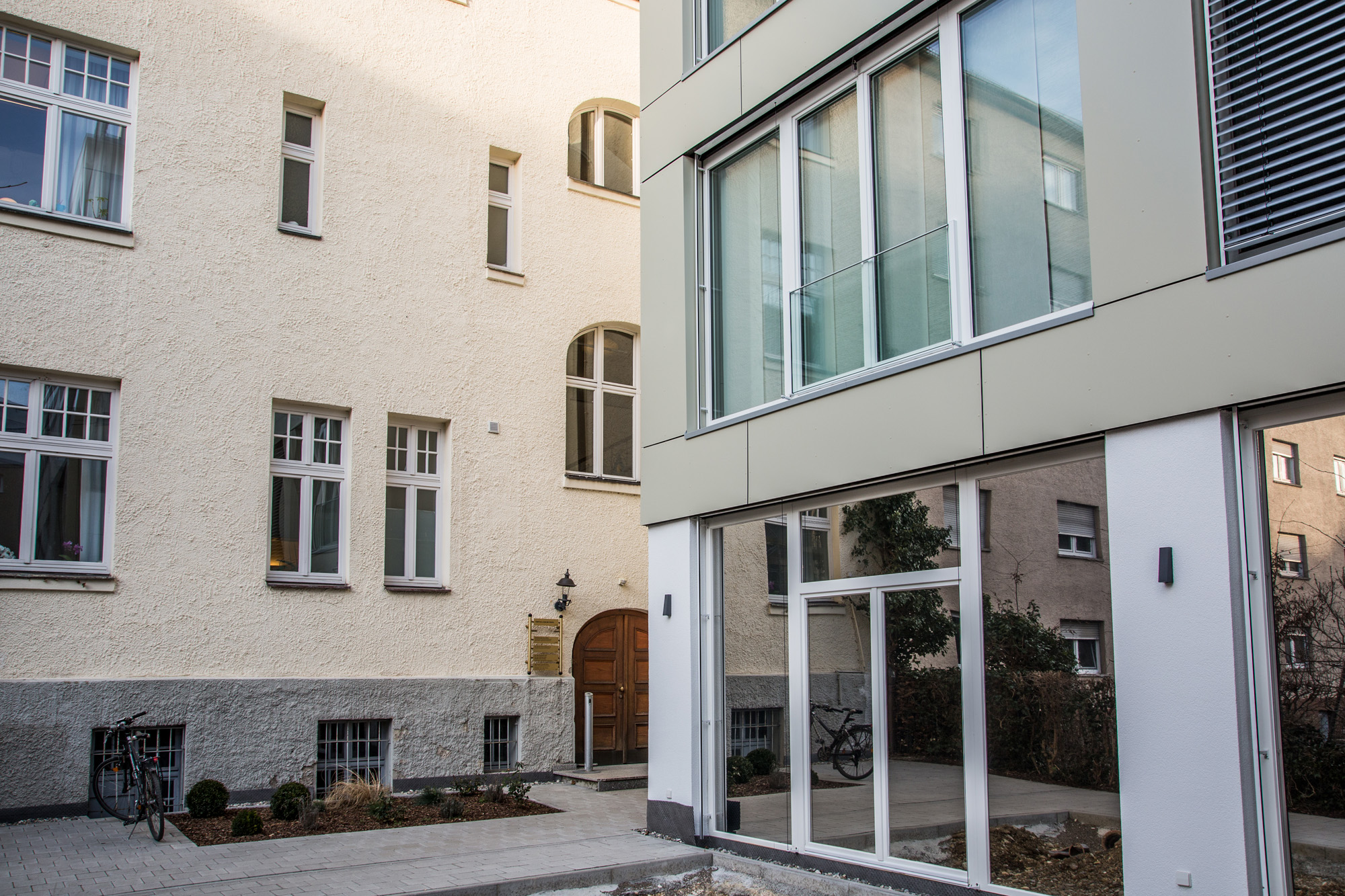 Der Neubau wurde konventionell in Massivbauweise errichtet. Es sind 13 Neubau-Wohnungen in attraktiver Citylage entstanden mit Wohnflächen von ca. 46–100 m² – von der Erdgeschoss-Wohnung mit Terrasse und Garten, über das 1-Zimmer-Apartment, bis zur 3-Zimmer-Maisonette-Wohnung mit Dachgarten. Unter dem Neubau befindet sich die Tiefgarage. Der Zufahrt hierzu erfolgt über zwei Pkw-Aufzüge.