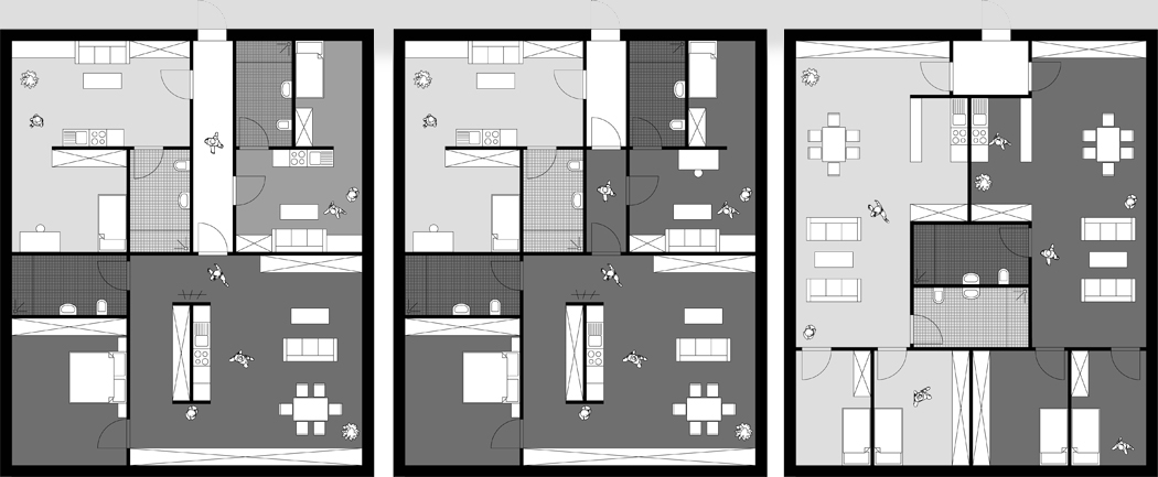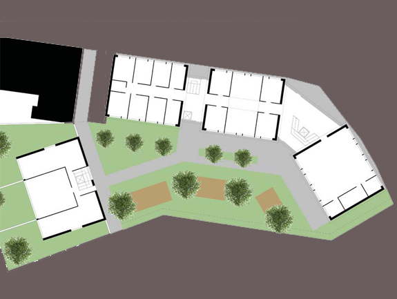 Entsprechend der Bebauung in Wiblingen wird vorgeschlagen, die städtebauliche Kontur des Ortseingangs an dieser Stelle fort zu führen. Die Bebauung folgt dem Straßenverlauf, gliedert sich jedoch in zunächst drei verschiedene Baukörper und nimmt die Höhen der Umgebung auf. Die Verbindungen zwischen den Häusern sind luftig aus Glas und beinhalten Treppenhäuser, Aufzüge und die allgemeinen Kommmunikationszonen, in denen man sich trifft, verweilt oder einfach nur den Blick auf das nahe gelegene Kloster Wiblingen genießt. Die Gartennutzung erschließt sich allen Bewohnern über diese Verbindungen einerseits und steht den jeweiligen Nutzungen im EG andererseits zur Verfügung.