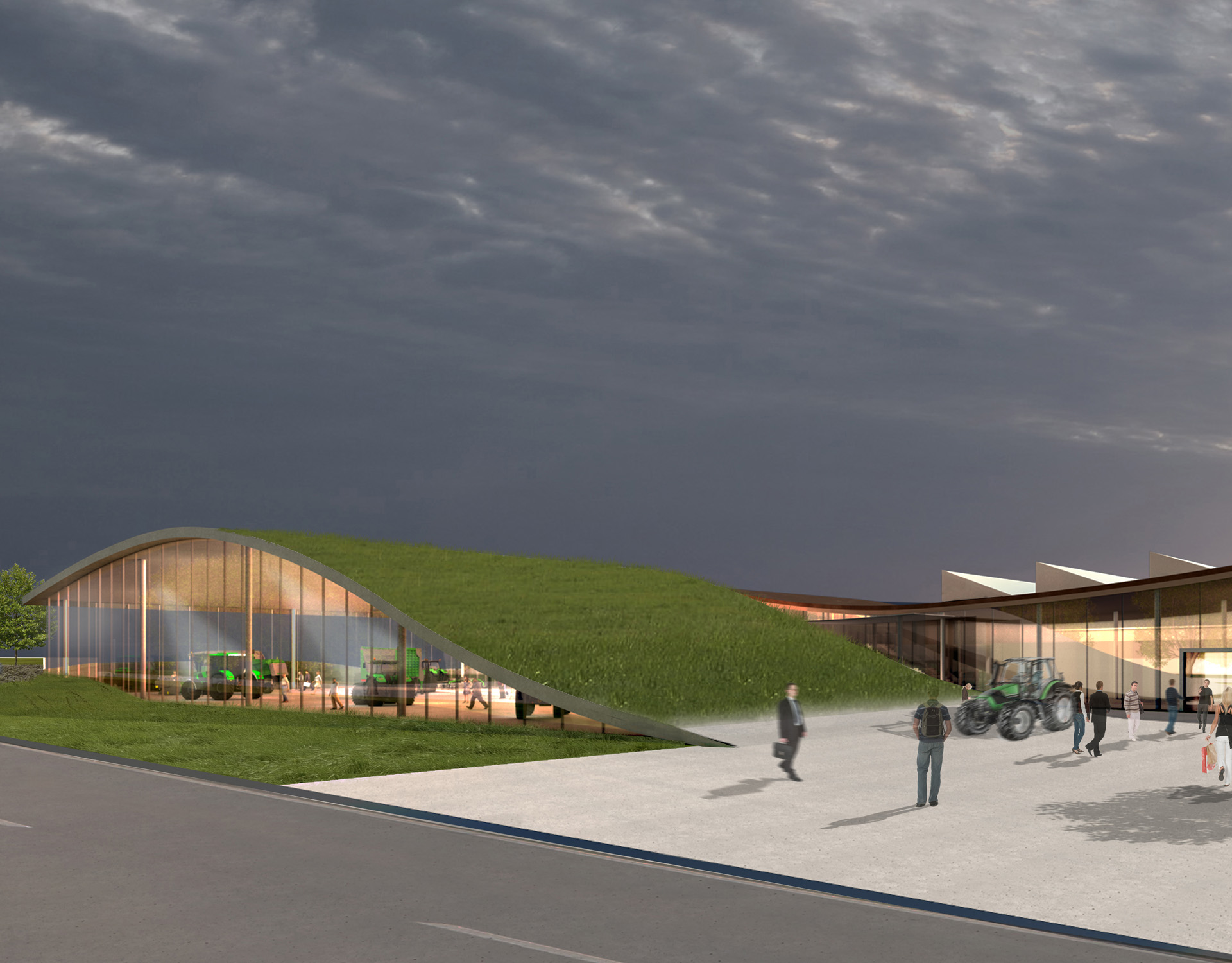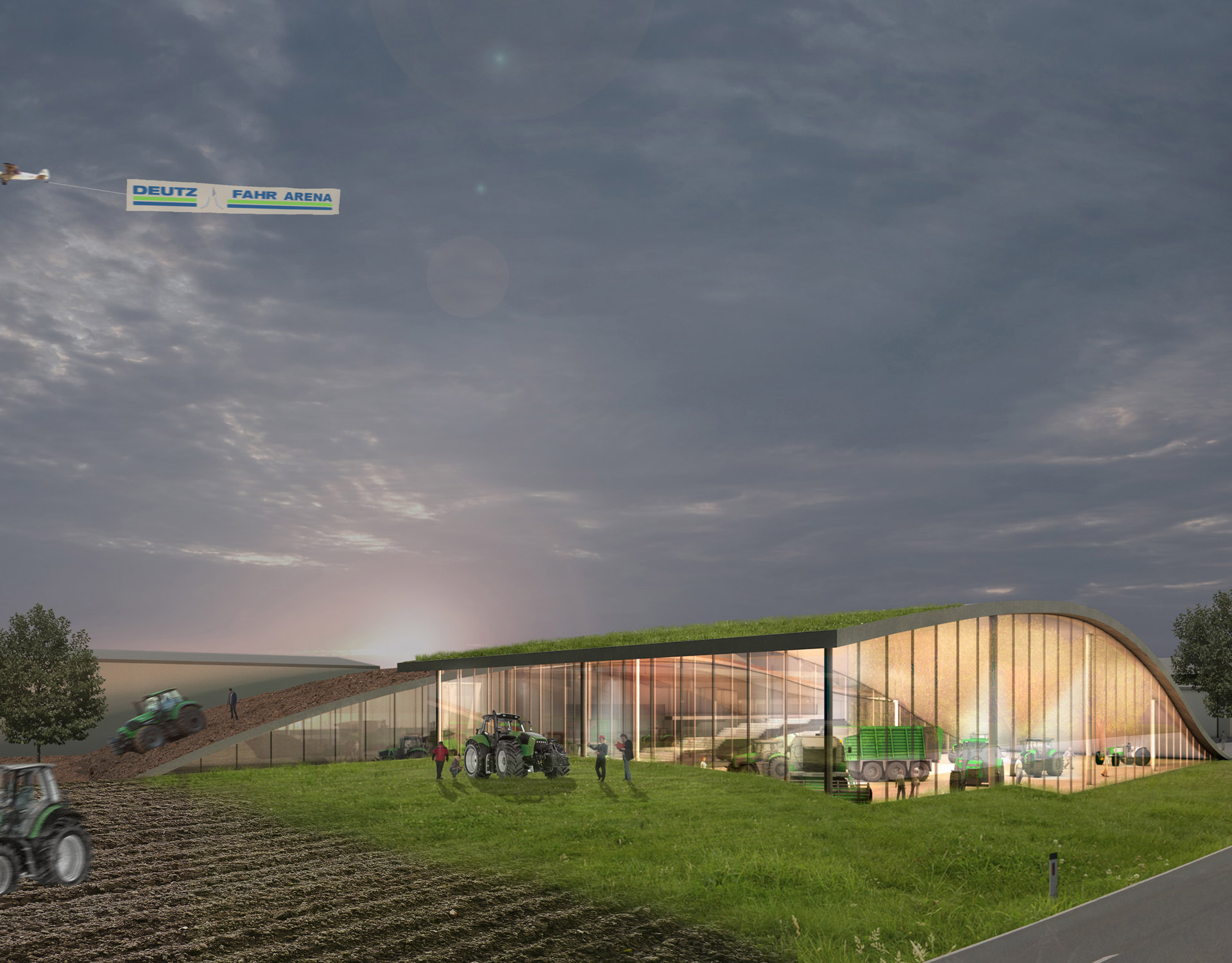 Hullak Rannow hat an der Finalrunde des Ideenwettbewerbs „DEUTZ-FAHR Arena“ teilgenommen. Es galt, ein neues Besucherzentrum zu entwerfen. Die zu bearbeitende Landschaft, das Feld ist das Arbeitsgebiet der Traktoren und Mähdrescher. Das Gebäude soll an Ackerfurchen erinnern. Der Bezug zu seiner Arbeitsgrundlage schafft die bodenständige Identifikation beim Kunden. Von der öffentlichen Straße aus wird das transparente Gebäude als Ausstellung für Traktoren und Mähdrescher erkannt. Das Gebäude schließt an das bestehende Museum an und wird zwischen Museum und Ausstellung betreten. Über die Infothek und einen Info-/Wartebereich kommt man in die Ausstellung. Die weiteren Nutzungen wie Kinderbetreuung, Kino, Zugang zur Galerie, auf der sich der Cateringbereich und die Meetingräume befinden, erfolgt komplett aus dem Eingangs-, Warte- und Infobereich. Über die Rampe der Fuge eröffnet sich der Blick auf die gesamte Ausstellung für Kunden und Besucher. Sie führt in das Obergeschoss des Cateringbereiches und gibt gleichzeitig vielfältige und beeindruckende Blicke auf die Ausstellung frei. Die unterschiedlichsten Arten der Messen, Events und Veranstaltungen erhalten hiermit die optimalen Ausstellungsbedingungen.