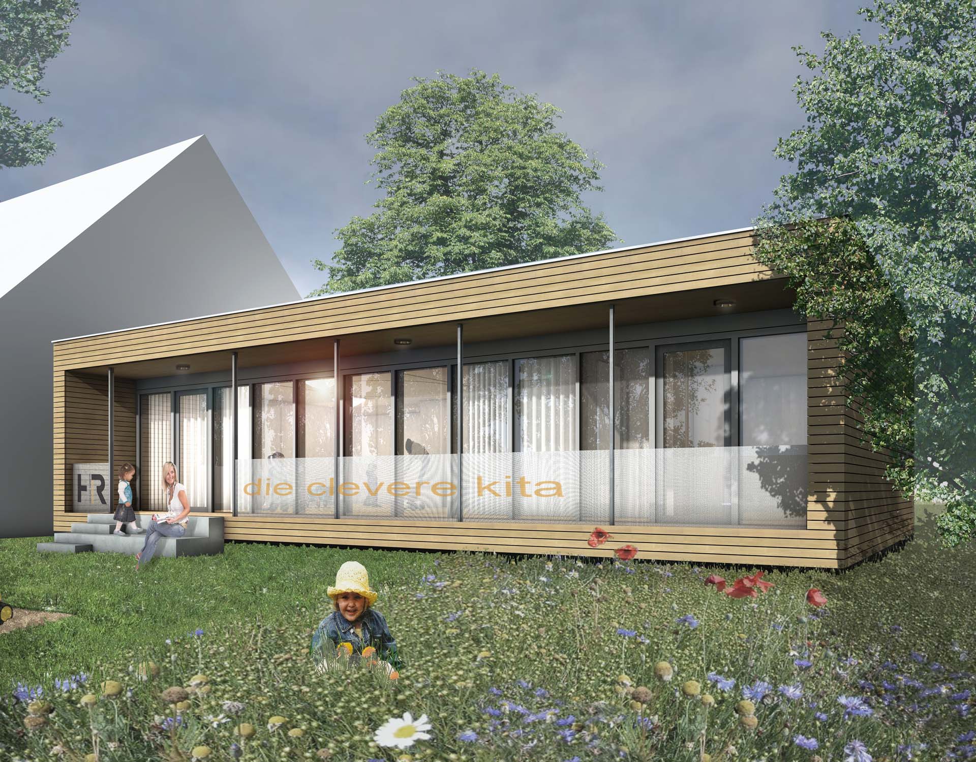 Hullak Rannow Architekten entwickelten im Jahr 2012 gemeinsam mit der Stadt Ulm ein Modul zur schnellen und kostengünstigen Erweiterung von Kitas: „Die Clevere Kita“. Das Modul sollte helfen, die durch das neue Kinderförderungsgesetz benötigten Kitaplätze schnellstmöglich zu schaffen. Im Team mit mehreren Handwerksbetrieben baute man fünf solcher Kitas in Ulm und eine weitere in Schwabmünchen. Die fünf Kitas in Ulm wurden unter Federführung der IBS Ingenieurgesellschaft mbH schlüsselfertig erstellt. Die Module sind in Holzrahmenbauweise mit Bauteilen in Passivhausqualität ausgeführt, können somit kostengünstig vorgefertigt und schnell aufgebaut werden. Die Kita ist nicht nur innerhalb von drei Monaten fertig, sondern erfüllt höchste ökologische und energetische Standards, ist kostengünstig und wurde von der Deutschen Gesellschaft für nachhaltiges Bauen (DGNB) vorzertifiziert. Die Vorteile des Produkts sind die extrem kurze Bauzeit sowie die Berücksichtigung von Anforderungen an die Nachhaltigkeit. Es galt, Bauteile in Passivhausqualität zu konzipieren, die schnell und günstig zu produzieren und aufzustellen sind. Ein einfacher, günstiger Betrieb und Unterhalt musste dabei gewährleistet werden. Von den fünf für die Stadt Ulm gebauten Kitas wurde für die Kita im Neunkirchenweg (2-gruppige, frei stehende Einrichtung) beispielhaft das DGNB Vorzertifikat in Silber verliehen. Anhand der Bewertungskriterien der DGNB werden die Vorteile, die aus der Bauart – Module in Holzbauweise – resultieren, ebenfalls sichtbar. Im Lebenszyklus der Kita entstehen niedrige Kosten. Das Gebäude ist flexibel und jederzeit umnutzbar, die Gebäudehülle ist von hoher technischer Qualität, leicht zu reinigen und instand zu halten. Primärenergie wird nur in geringem Maß verbraucht. Durch die Modulbauweise in Holz ist ein Gebäude mit hoher ökologischer, ökonomischer und technischer Qualität entstanden. Daraus liest man, dass es – neben einer guten Gestaltung – im Wesentlichen darauf ankommt, die richtigen Materialien am richtigen Ort zum richtigen Zweck einzusetzen. Schon zu Beginn, bei der Erarbeitung der Konzeption, wurde im Team mit den ausführenden Firmen eng zusammengearbeitet. Die Kita konnte und kann somit jederzeit wieder schlüsselfertig angeboten werden.