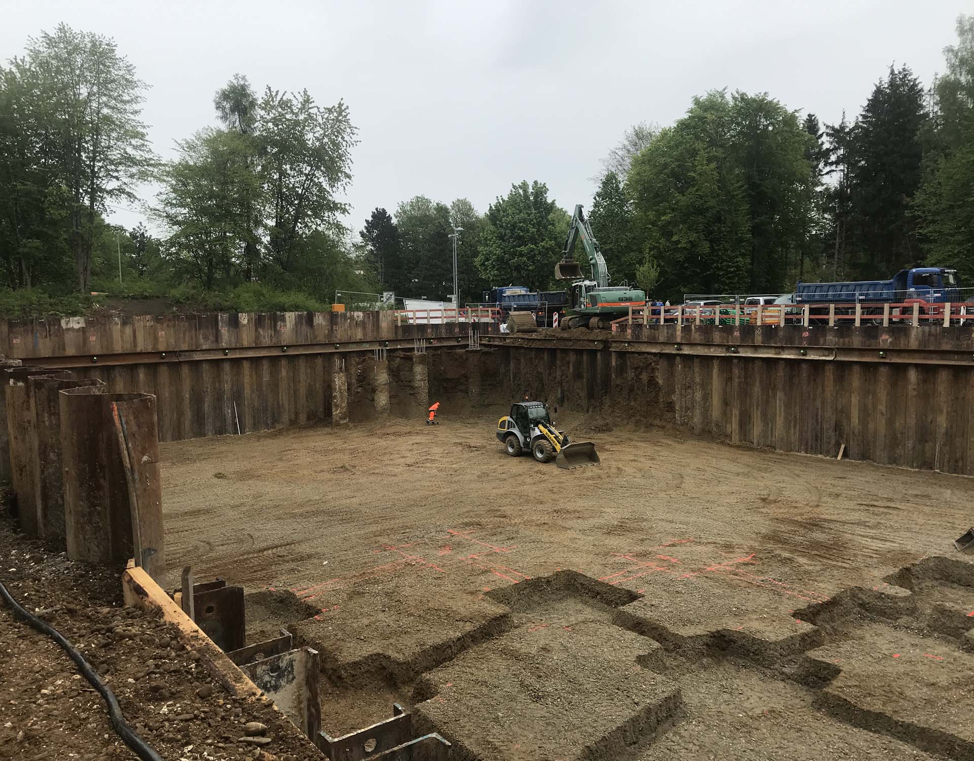 Auf der Baustelle im Wiblinger Hart 4 sind die Arbeiten für den Verbau samt Aushub fertiggestellt. Die Fundamente werden als nächstes erstellt. Auf dem Bild sind die ersten Fundamentgräben zu sehen.