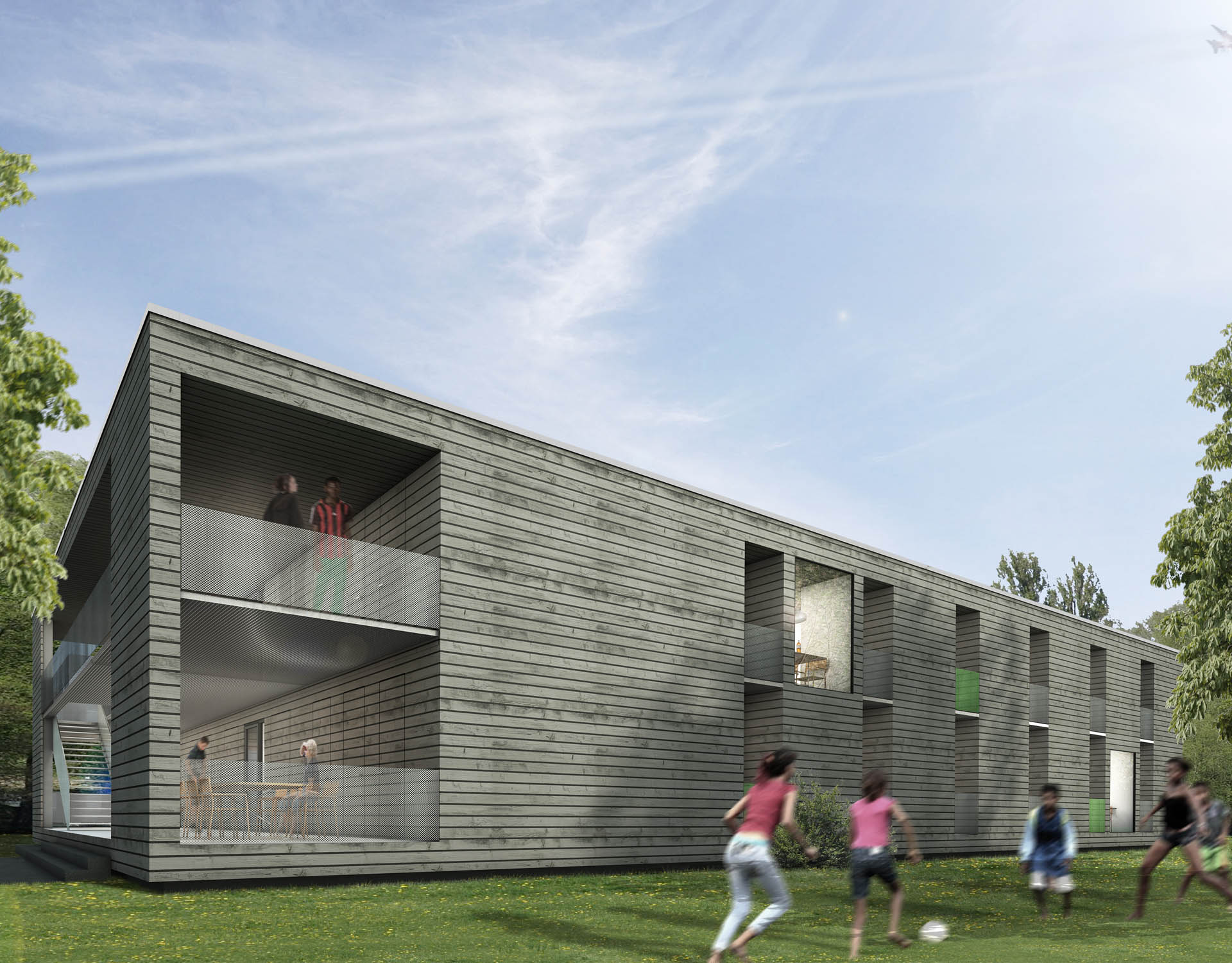 „Wir bauen für Menschen und nicht für Dinge! Container sind ein Lagerort für Güter.“ Deshalb sind für Jens Rannow und Bernd Hullak Containerlösungen als längerfristiger Wohnraum ein völlig falscher Denkansatz. Aktuell rücken Container bei der Frage nach der Unterbringungsmöglichkeit von Flüchtlingen notgedrungen wieder in den Fokus vieler Kommunen. Hullak Rannow wollen einen zukunftsfähigen Beitrag für dieses gesellschaftliche Problem leisten. „F3“ entstand im eigenen Zukunftslabor. Die Architekten entwickelten ihre Raummodule in Holzrahmenbauweise zu diesem Zweck weiter. Es sind Module entstanden, die flexibel für drei verschiedene Arten der Nutzung anwendbar sind F3 = 3-fach flexibel: Sozialer Wohnungsbau, Flüchtlingswohnen und Studentenwohnen. Damit wird eine langfristige Nutzung gewährleistet und macht F3 somit auch in finanzieller Hinsicht attraktiv. Das vorliegende Grundkonzept ist wandelbar, günstig und schnell zu erstellen. Das Gebäude hat gestalterische Qualität und wird aus nachhaltigen Baustoffen gebaut. Die Grundkonfiguration sieht ein zweigeschossiges Gebäude vor, in dem bis zu 60 Personen Platz finden. Das Gebäude ist individuellen Anforderungen leicht anzupassen und kann auch mit mehr als zwei Geschossen oder einer höheren Belegung realisiert werden. Die Basiskonfiguration eines Apartments beinhaltet eine Nasszelle und eine Kochmöglichkeit. Das Ausbilden von Nischen im Grundriss ermöglicht eine Vielzahl von Nutzungsszenarien bei gleichzeitigem Erhalt der Privatsphäre. Das Zurückversetzen der Fenster in der Fassade verhindert durch indirekte Verschattung das Überhitzen der Räume, die zurückversetzten Eingangsnischen bringen räumliche Qualitäten in den Flur. Die Nischen ermöglichen bei der Nutzung als Flüchtlingswohnheim eine höhere Belegung der Räume. Die schnelle Erstellung wurde erfolgreich bei den Kitas erprobt. Eine lange Planungszeit entfällt, da die einzelnen Raummodule bereits fertig konzipiert sind und nur an die Gesamtsituation angepasst werden müssen.