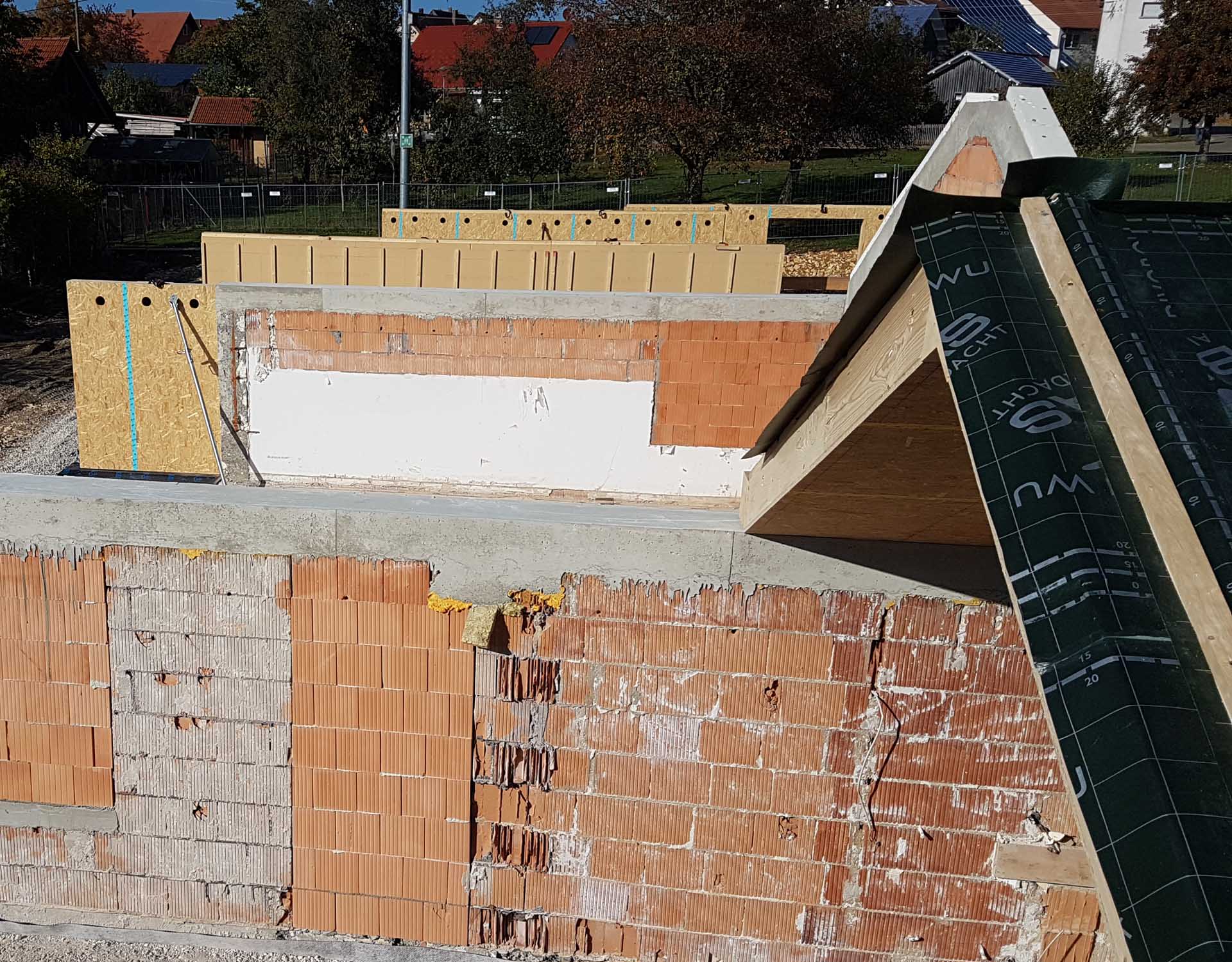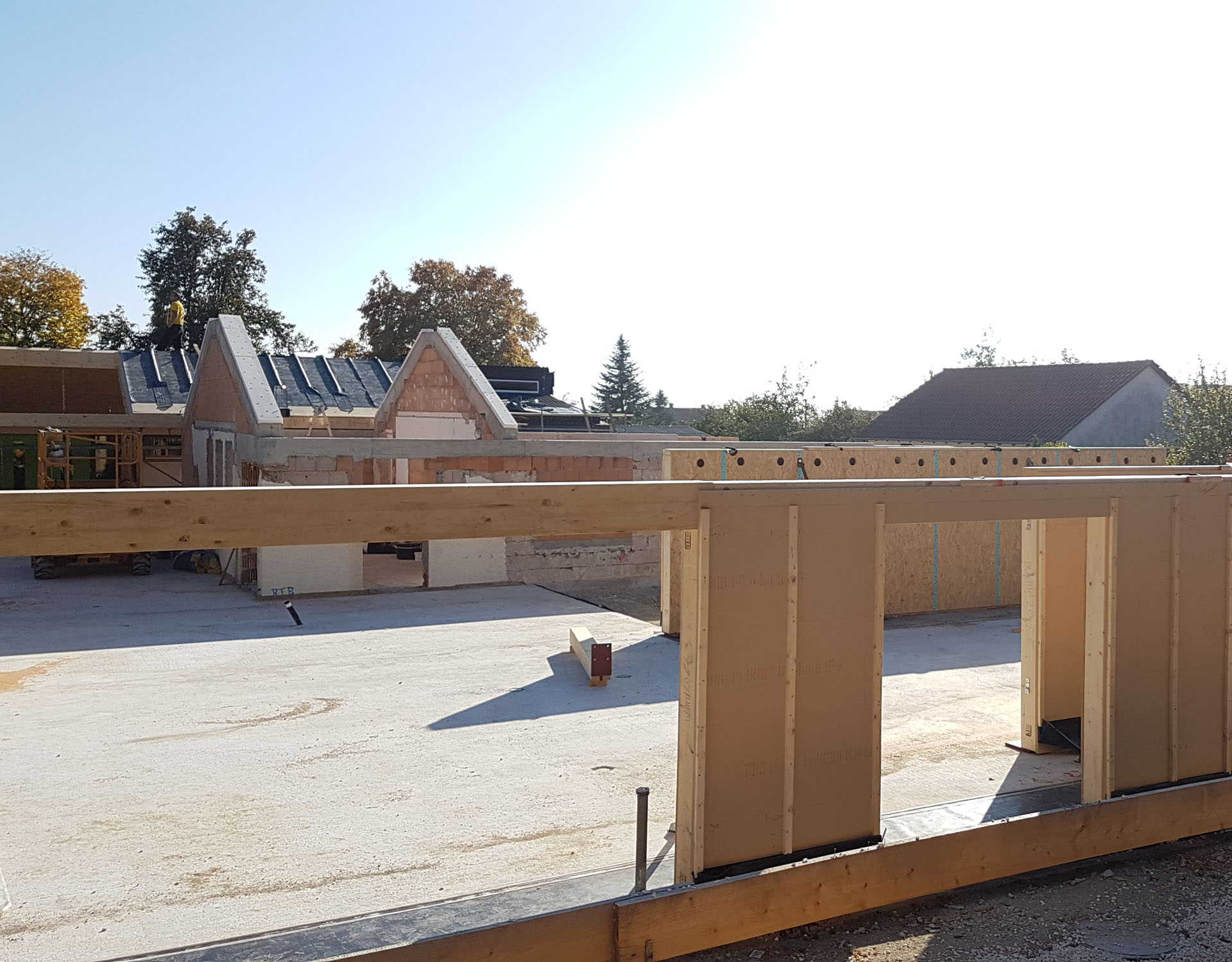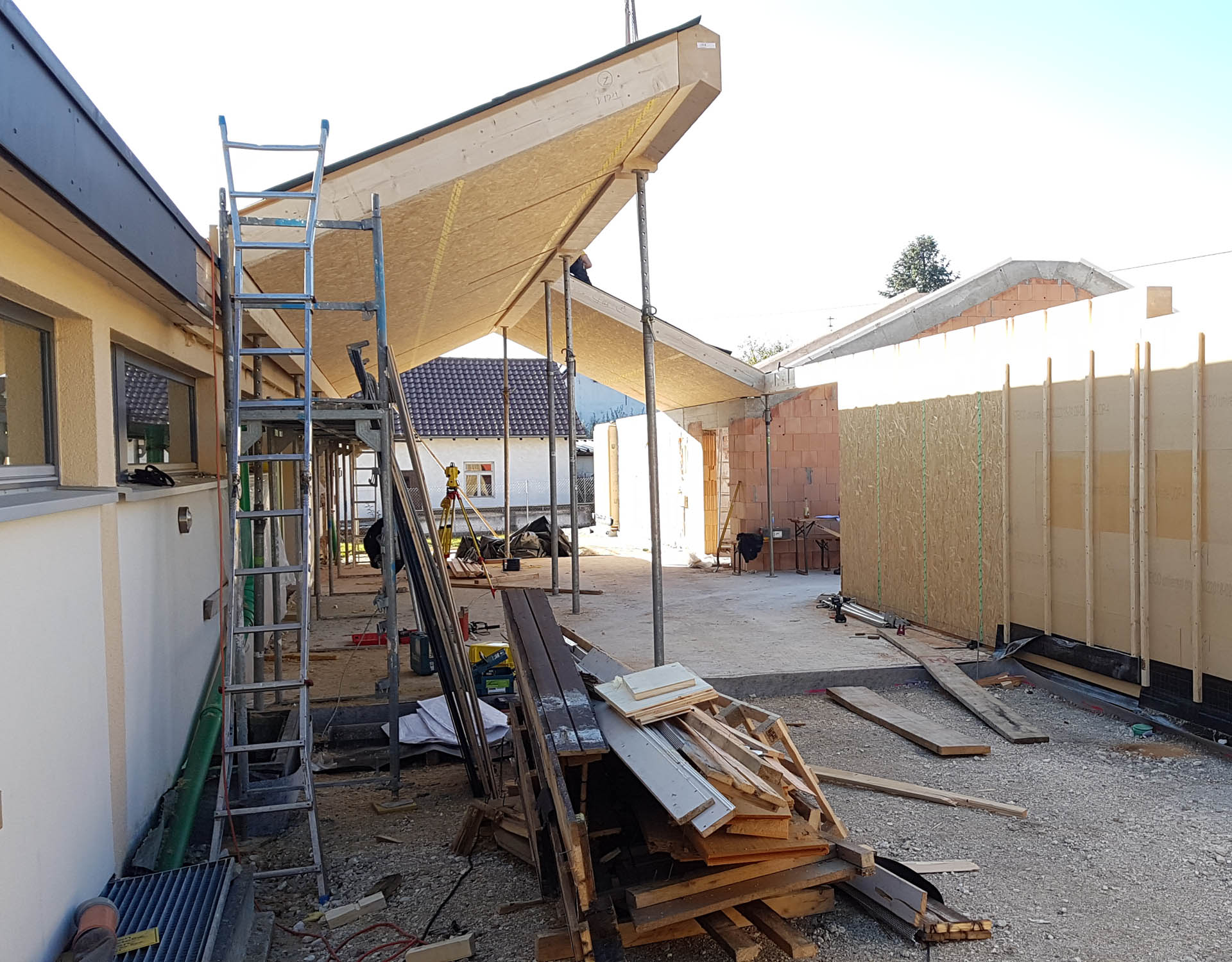 Nachdem die Bodenplatte fertig ist und der Anbau fast komplett abgerissen wurde, wird nun der Neubau (Holzbau) aufgerichtet. Dieser schließt sich direkt an das Bestandsgebäude an.