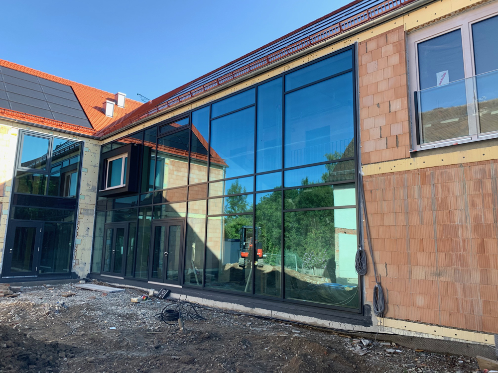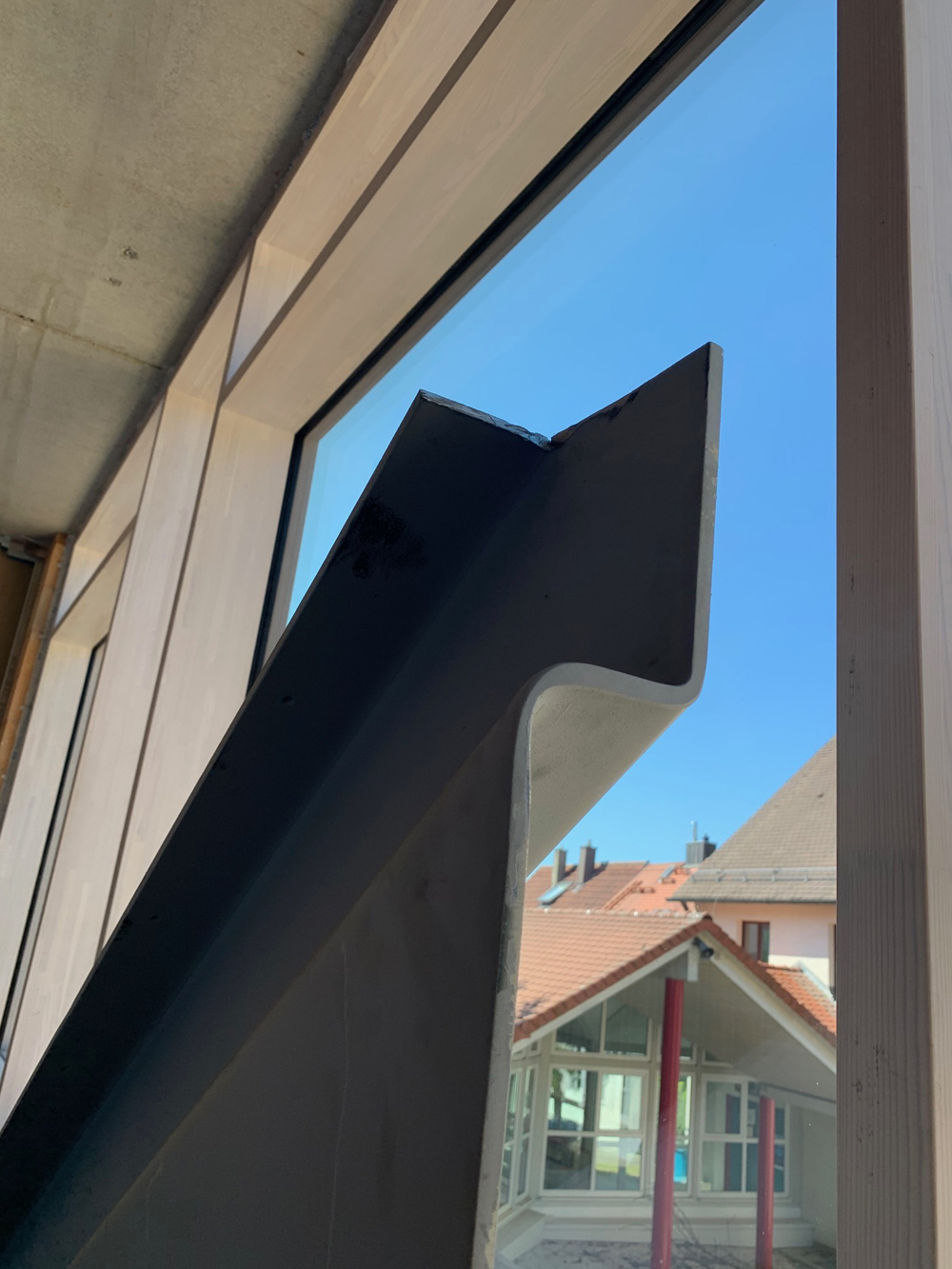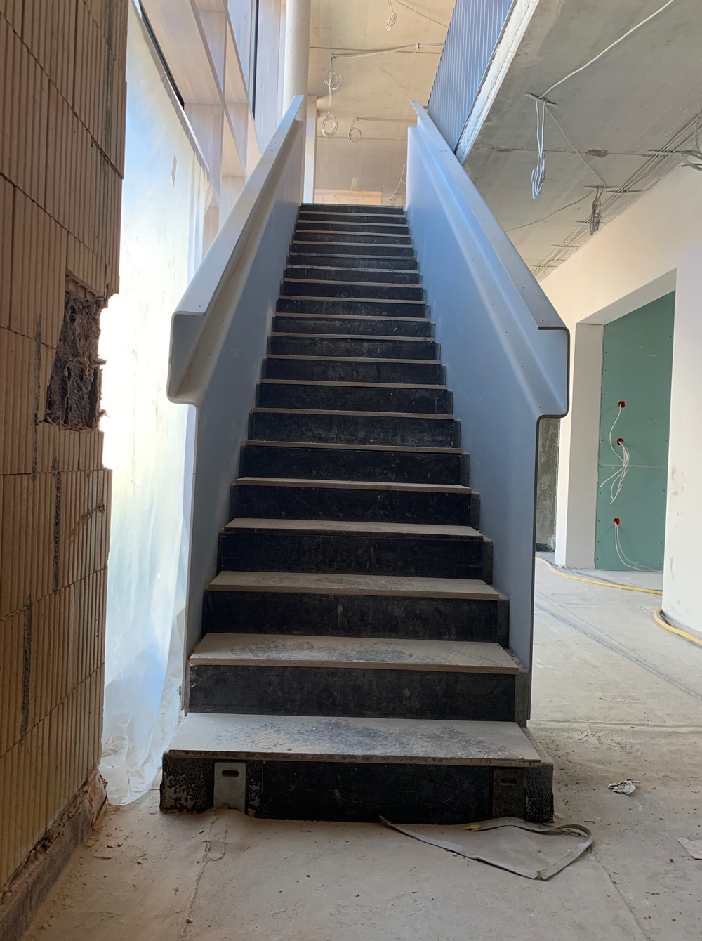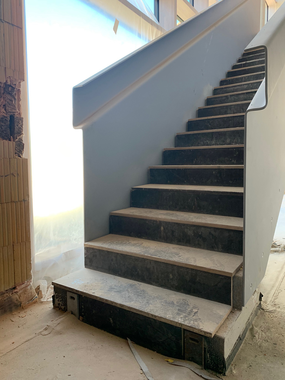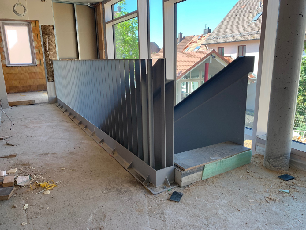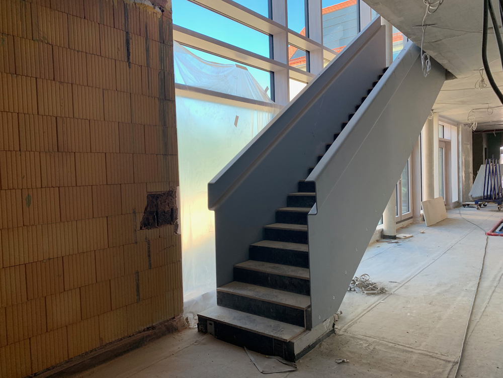 Das Geländer für die Treppe im Haupttreppenhaus wurde geliefert. Die Handwerker hatten ordentlich was zu tun. Das Stahlgeländer ist aus einem Stück und wurde von vorne mit dem Kran angeliefert, auf Hubwägen durchs Gebäude transportiert und wurde dann montiert. Es wird noch farbig lackiert und erhält halbrunde Handläufe aus Holz (passend zur Fassade).