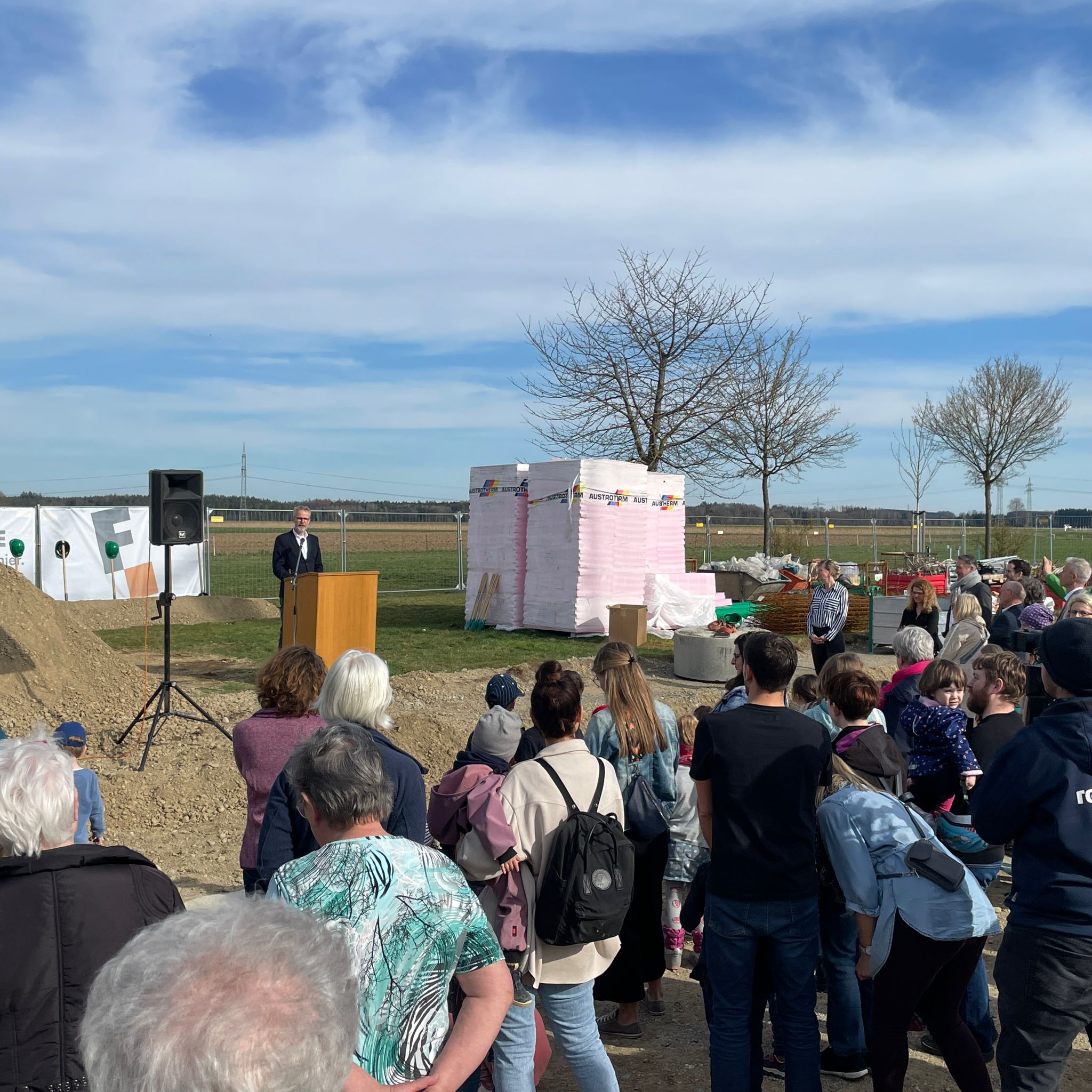 der Bau der zweigeschossigen Kita hat nun begonnen, gebaut wird die Kita auf nachhaltige Art in Holzsystembauweise mit Dachbegrünung. Die Krippe ist im Erdgeschoss geplant, die drei Kindergartengruppen im ersten Stock.